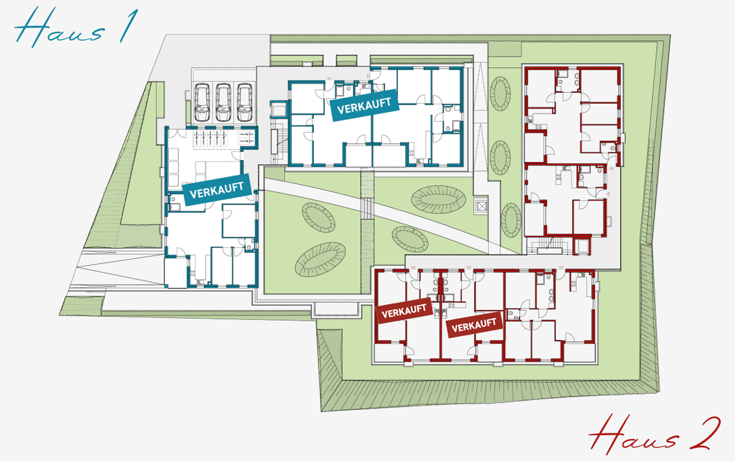 Obergeschossen. Im Untergeschoss befinden sich die gemeinsame Tiefgarage mit XL-Stellplätzen, Technik, Fahrradraum und